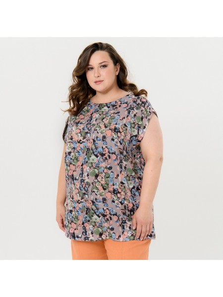 Блуза со спущенным плечом прямого кроя. Вырез горловины "лодочка". В боковых швах разрезы.