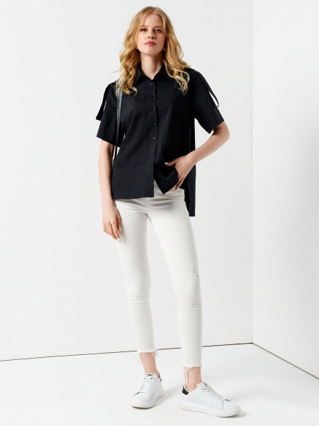 Стильная женская блуза с удлиненными нагрудными карманами станет отличной альтернативой классической рубашке в элегантных образах. Модель прямого кроя будет хорошо смотреться с классическими брюками, с прямыми и зауженными юбками, джинсами и шортами-бермудами. Блуза с коротким рукавом подойдет для офисного дресс-кода и для романтичных повседневных образов. Блуза женская будет отлично смотреться в многослойных сочетаниях с полувером или кардиганом и облегающими брюками скини. Белая блуза гармонично сочетает в себе элементы классического стиля и casual детали. Благодаря прямому крою и широким рукавам блузка рубашка свободно садится по фигуре и оставляет полную свободу движений. В этой стильной одежде вы будете чувствовать себя максимально комфортно даже в жаркую погоду. Нарядная женская блуза с классическим воротником будет хорошо смотреться на любой фигуре. Заказать ее можно для создания образов для офиса, посещения учебного заведения, семинаров, деловых встреч или фотосессий