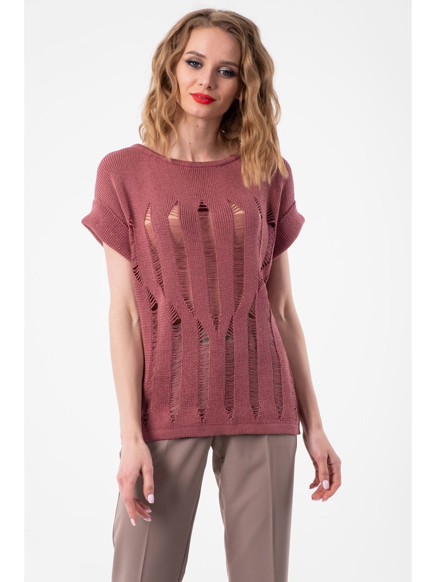 Стильный джемпер свободного силуэта розового цвета. Джемпер выполнен в технике ручного вязания из натуральных нитей. Круглый вырез изделия обработан двусторонней лицевой бейкой. По переду изделия выполнен ажурный рисунок. Аксессуары в комплект не входят.