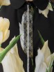 Стильная рубашка полуприлегающего силуэта из текстильного полотна черного цвета с цветочным принтом. Отложной воротник, планка и манжеты выполнены из однотонного черного трикотажного полотна. Втачные рукава выполнены из цветного шифона и обработаны манжетами с застежкой на пуговицу. Перед изделия дополнен планкой с застежкой на пуговицы.