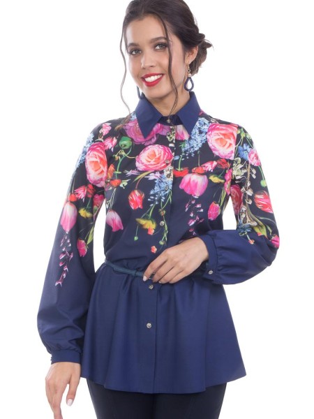 Стильная деловая рубашка полуприлегающего силуэта из текстильного полотна синего цвета с цветочным купонным принтом. Круглый вырез изделия обработан отложным воротничком. Втачные рукава обработаны манжетами с застежкой на пуговицу. Перед изделия дополнен планкой с застежкой на пуговицы