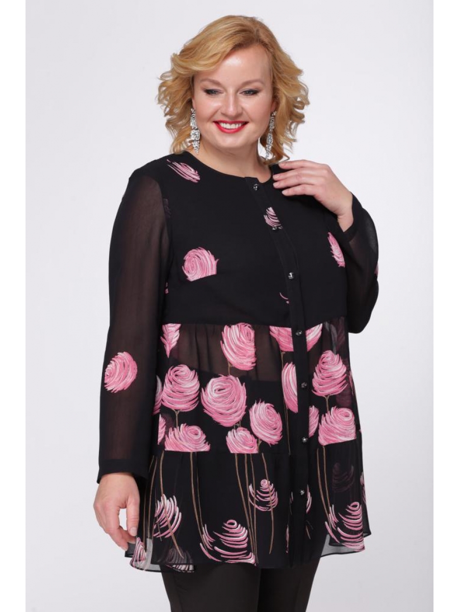 Блуза женская А силуэта. Вырез горловины круглый. По центру переда приточная планка. По планке обработана застежка на 6 прорезных петель и 6 пуговиц. По переду и спинке горизонтальные подрезы. Рукав втачной одношовный.