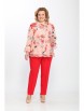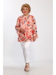 Блуза женская свободного силуэта с топом. Блуза: Вырез горловины округлой формы, воротник стойка прилегающая к горловине. По переду центрально-бортовая застежка на 6 прорезных петель и пуговиц. Рукав втачной одношовный с притачными по низу воланами. По низу блузы притачные воланы. Топ выполнен из трикотажного полотна. Вырез горловины круглый.