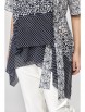 Блузка свободного А-образного силуэта выполнена из шифона с набивным рисунком. Блузка на трикотажной подкладке. Полочка блузки многослойная с драпировкой и поясом, завязывающимся с левой стороны. Низ блузки ассиметричный. Спинка цельная. Рукав втачной, короткий, одношовный.