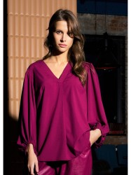 Блуза женская, полуприлегающего силуэта. По полочке идет нагрудная выточка из бокового шва. Вырез V-образной формы с планками и складкой по центру. По спинке средний шов, рукав объёмный, по окату сборка. Низ рукава фигурный, на резинке.