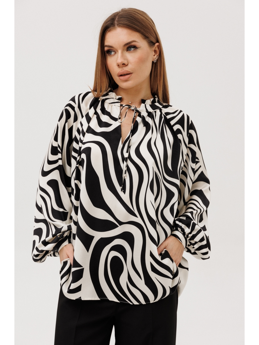 Оформить заказ →Блузка свободного силуэта (стиль оверсайз) с рукавом реглан. Горловина с разрезом спереди и притачной планкой с рюшей. Рукав на манжете. Модель без подкладки, не просвечивает.