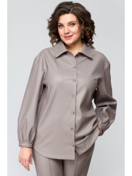 Рубашка прямого силуэта, выполнена из экокожи. Полочка рубашки с нагрудными вытачками и центральной застежкой на петли и пуговицы. Воротник рубашечного типа стояче-отложной. Спинка цельная. Низ блузки фигурный. Пройма углубленной формы, рукав рубашечного типа, с декоративными швами. По низу рукава обработаны встречные складки и притачная планка.