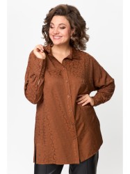Блузка прямого, свободного силуэта выполнена из однотонной ткани с жаккардовым эффектом рисунка под леопард. Полочка блузки с центральной застежкой в виде притачной планки на петли и пуговицы. Полочка блузки с нагрудными вытачками. Горловина круглой формы, обработана воротником рубашечного типа. Спинка с отрезной плечевой кокеткой и складкой по центру спинки. Пройма углубленной формы, рукав рубашечного типа, одношовный. В нижней части боковых швов выполнены разрезы. Рукав по низу со складками и на притачной манжете с застежкой на петли и пуговицы.