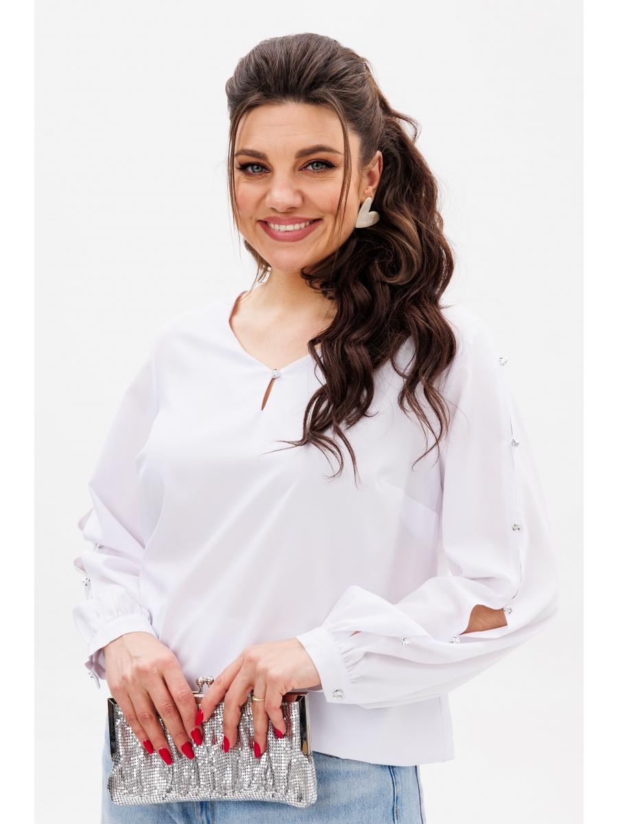 Изготовленная из мягкой на ощупь ткани, она обладает полуприлегающим силуэтом, который выгодно подчеркивает фигуру. Особенно привлекательны втачные рукава с разрезами по всей длине и навесными петельками, украшенными пуговицами на притачной манжете. Эти детали добавляют блузе изысканности и шарма. V-образный вырез горловины с функциональной застежкой дополняет образ и придает блузе некую загадочность.