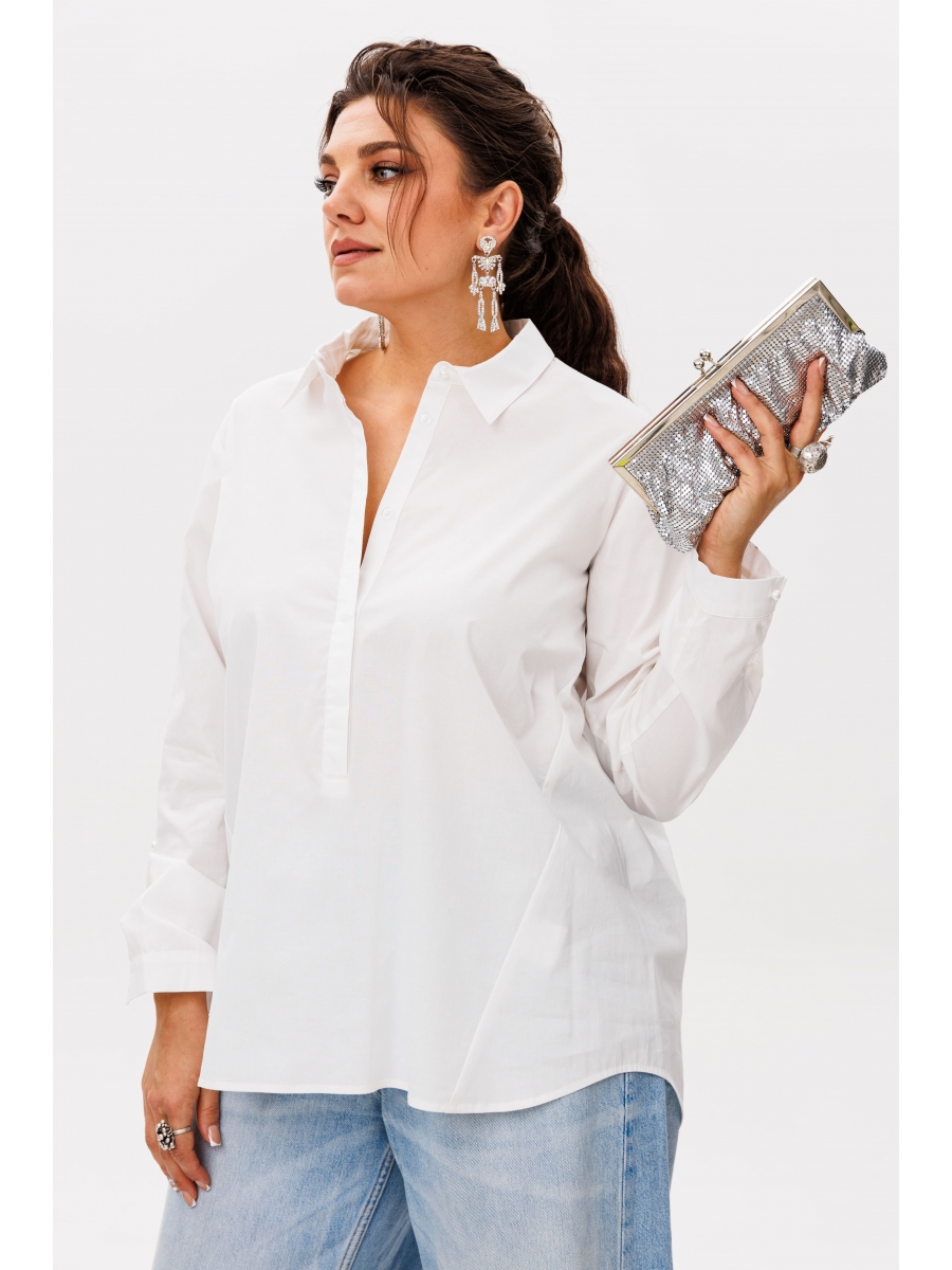 Созданная из мягчайшего хлопка, эта рубашка мягко следует за линиями тела, даря новое ощущение свободы. Её силуэт, плавно расширяющийся книзу, и выразительная асимметрия подола создают современный, скульптурный объем. Дизайн, в котором искусство кроя проявляется в каждой детали: смещенные боковые швы рисуют изящные рельефные линии, мягко направляя ткань и подчеркивая форму.