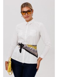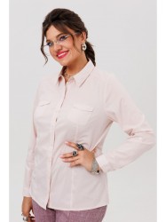 Классическая блуза отличается строгим и лаконичным дизайном. Ее передняя часть оформлена нагрудными вытачками, идущими от низа, и дополнена накладными карманами с закругленными краями. Спинка модели имеет талевые вытачки и цельнокроеную кокетку, которая плавно переходит на полочку, обеспечивая идеальную посадку по фигуре.