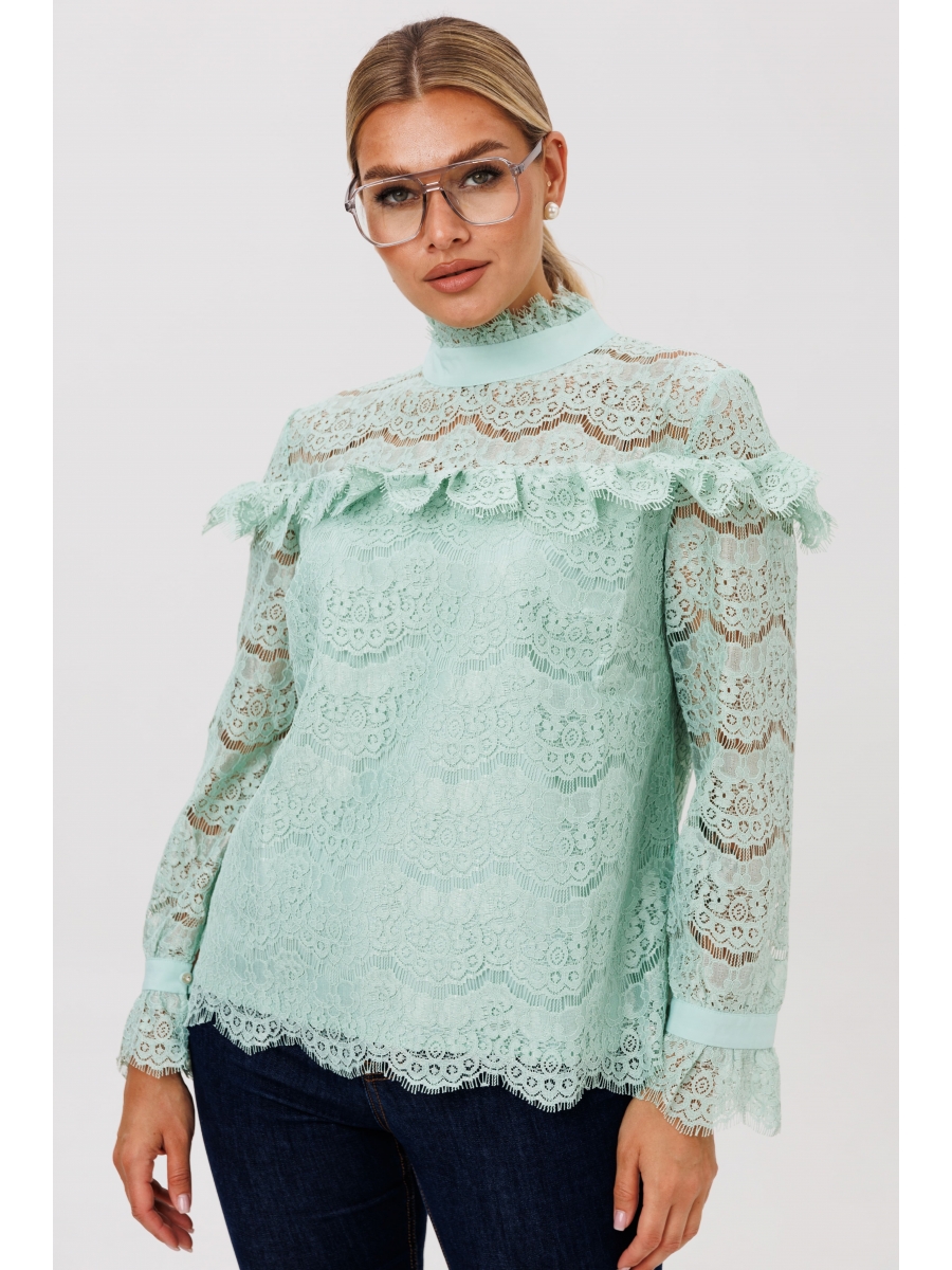 Кокетливая блуза с нотками романтизма выполнена из плотного кружевного полотна. Её прямой силуэт украшен изысканными конструкторскими деталями: отрезные кокетки по переду и спинке мягко подчеркнуты воланом, а воротник-стойка и королевские манжеты на рукавах декорированы ажурной кружевной отделкой. Застёжка на пуговицы, расположенная по задней стойке, добавляет модели особый шарм.