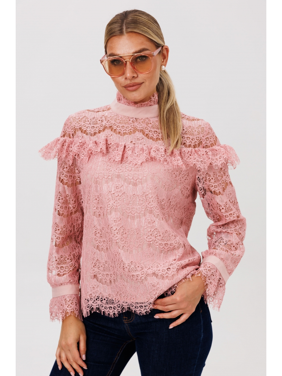 Кокетливая блуза с нотками романтизма выполнена из плотного кружевного полотна. Её прямой силуэт украшен изысканными конструкторскими деталями: отрезные кокетки по переду и спинке мягко подчеркнуты воланом, а воротник-стойка и королевские манжеты на рукавах декорированы ажурной кружевной отделкой. Застёжка на пуговицы, расположенная по задней стойке, добавляет модели особый шарм.