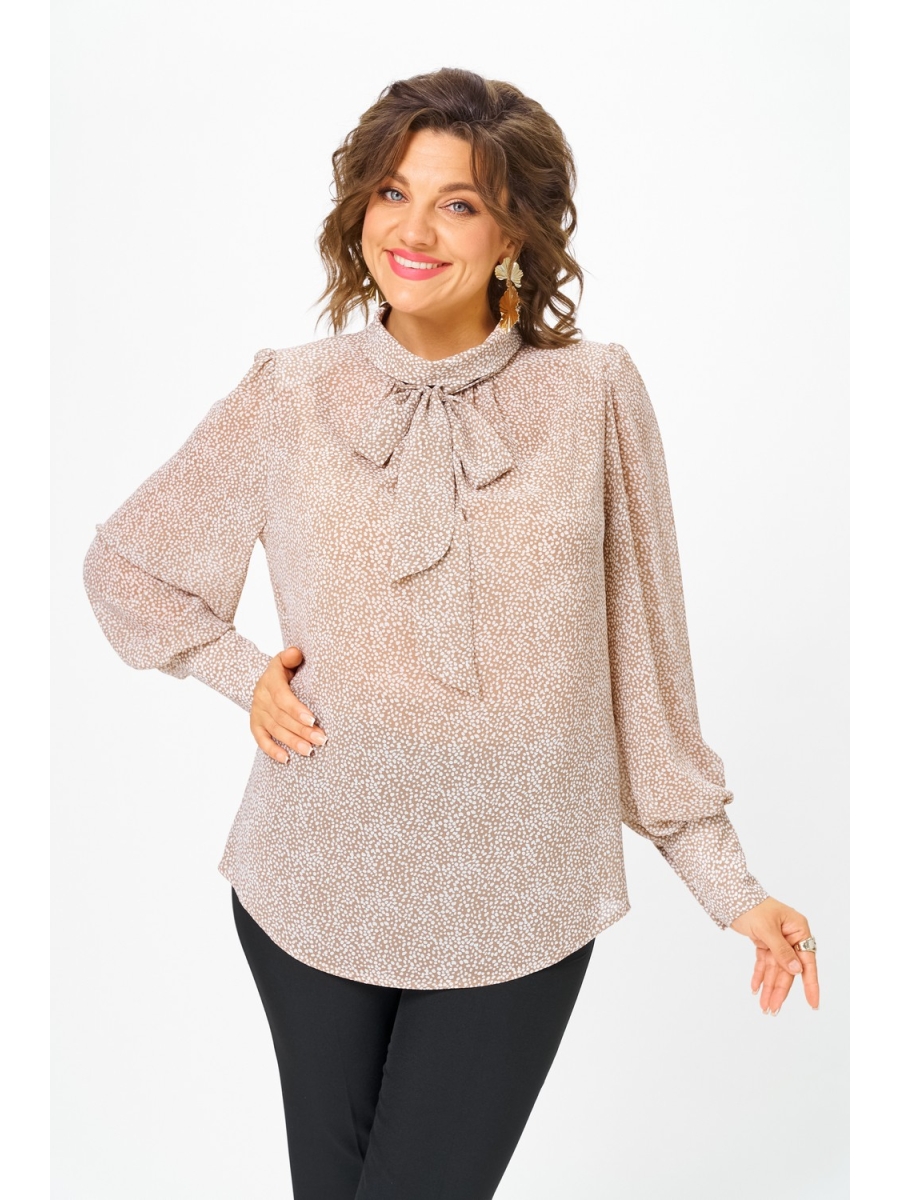 Блузка женская свободного силуэта, с втачным рукавом. Горловина переда с декоративной сборкой и воротником - хомут. Отделкой служит съемный бант. Спинка со средним швом и застежкой по воротнику на две воздушные петли и пуговицы. Рукав длинный со сборкой по окату и низу рукава, на широкой манжете с застежкой на петли и пуговицы.