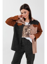 Отложной воротник на стойке и застёжка на пуговицы добавляют нотки строгости, а спущенное плечо с длинным втачным рукавом на манжете – удобство и практичность. Край кокетки на спинке обработан бахромой, что не может не привлекать внимания.