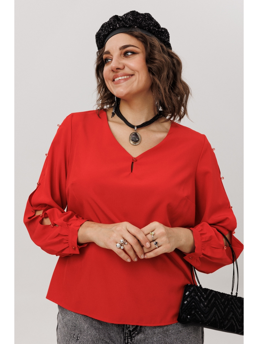 Мягкая ткань драпируется полуприлегающим силуэтом, ласково обрисовывая линии фигуры. Особое внимание притягивают рукава: втачные, с элегантными разрезами по всей длине, они завершаются манжетами на пуговицах, украшенными навесными петельками - деталь, придающая образу неповторимый шарм.