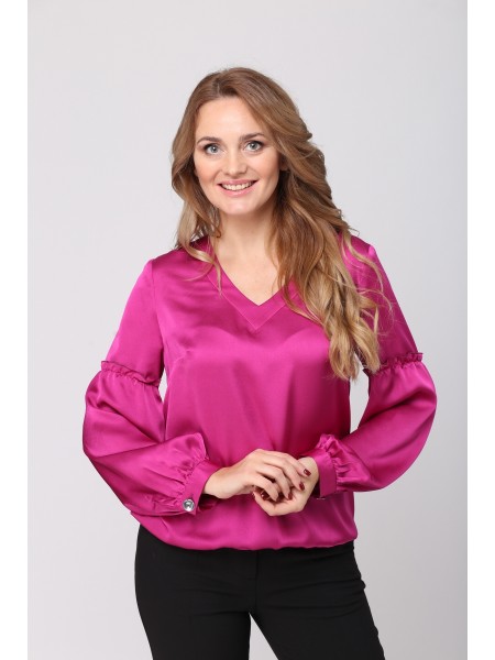 Очаровательная нарядная блузка из атласной ткани с содержанием эластана. Силуэт свободный прямой, низ изделия присобран на эластичную тесьму-резинку в виде кулиски. Вырез горловины V-образной формы обработан широкой бейкой. По переду лифа расположены нагрудные вытачки. Основным акцентом данной модели являются рукава, придавая образу определенный стиль и нарядность. Рукав втачной, длиной 59 см. Низ рукава присобран на притачную манжету. Манжет с застежкой на петлю-пуговицу. Добавьте любимые аксессуары, и блузка будет дарить вам разные образы. Сочетать можно с брюками разной длины и фасонов, с юбками всевозможных стилей и цветов - разнообразие образов вам гарантировано.