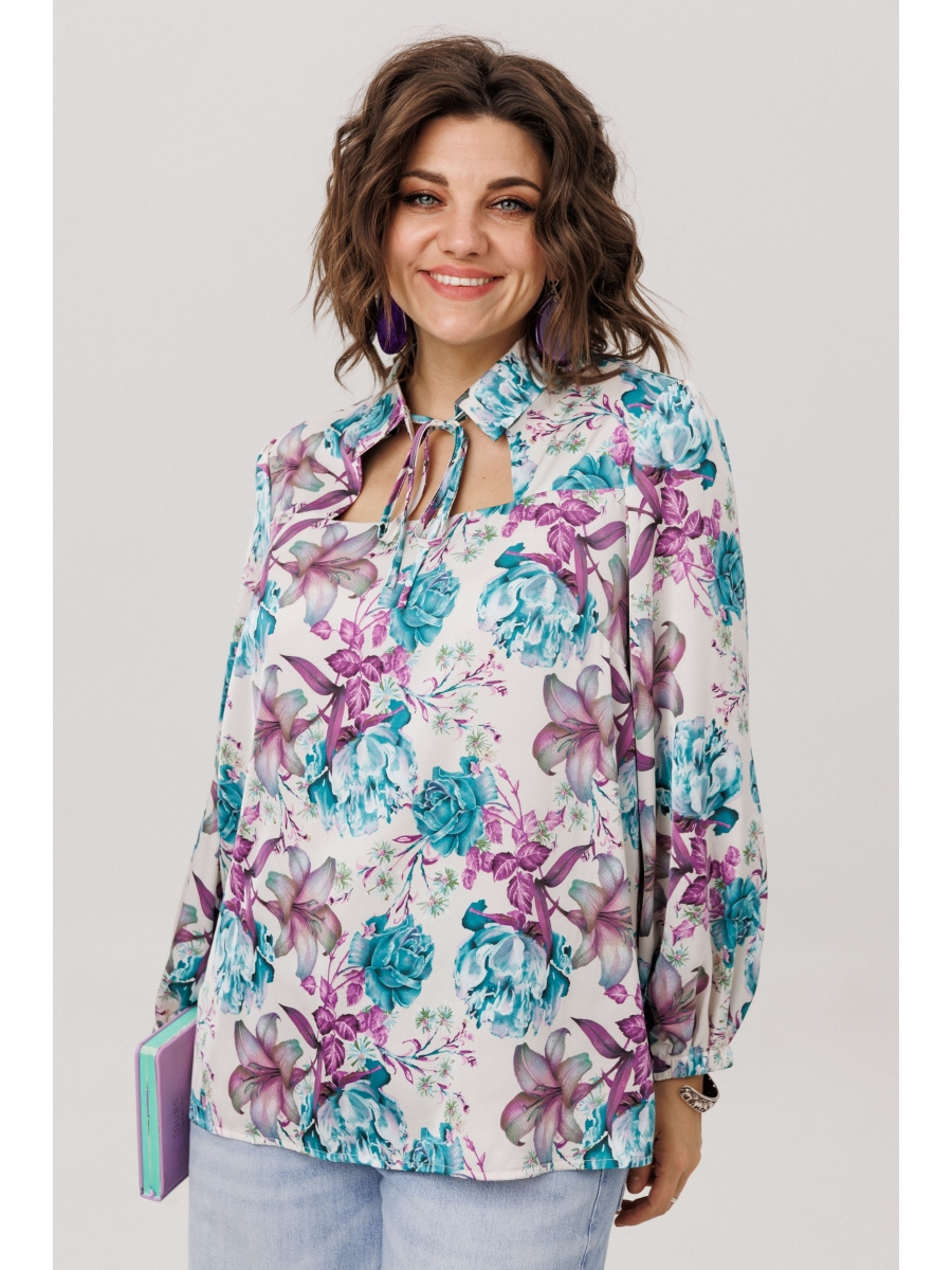Мягкие завязки вносят ноту непринуждённости, позволяя моделировать образ. Свободный силуэт, струящийся изящными складками, и удлинённые рукава на тонкой резинке дарят и комфорт, и безупречную линию. Утончённый флористический принт «розы лилии пионы» на благородной ткани наполняет её светом и воздушностью.