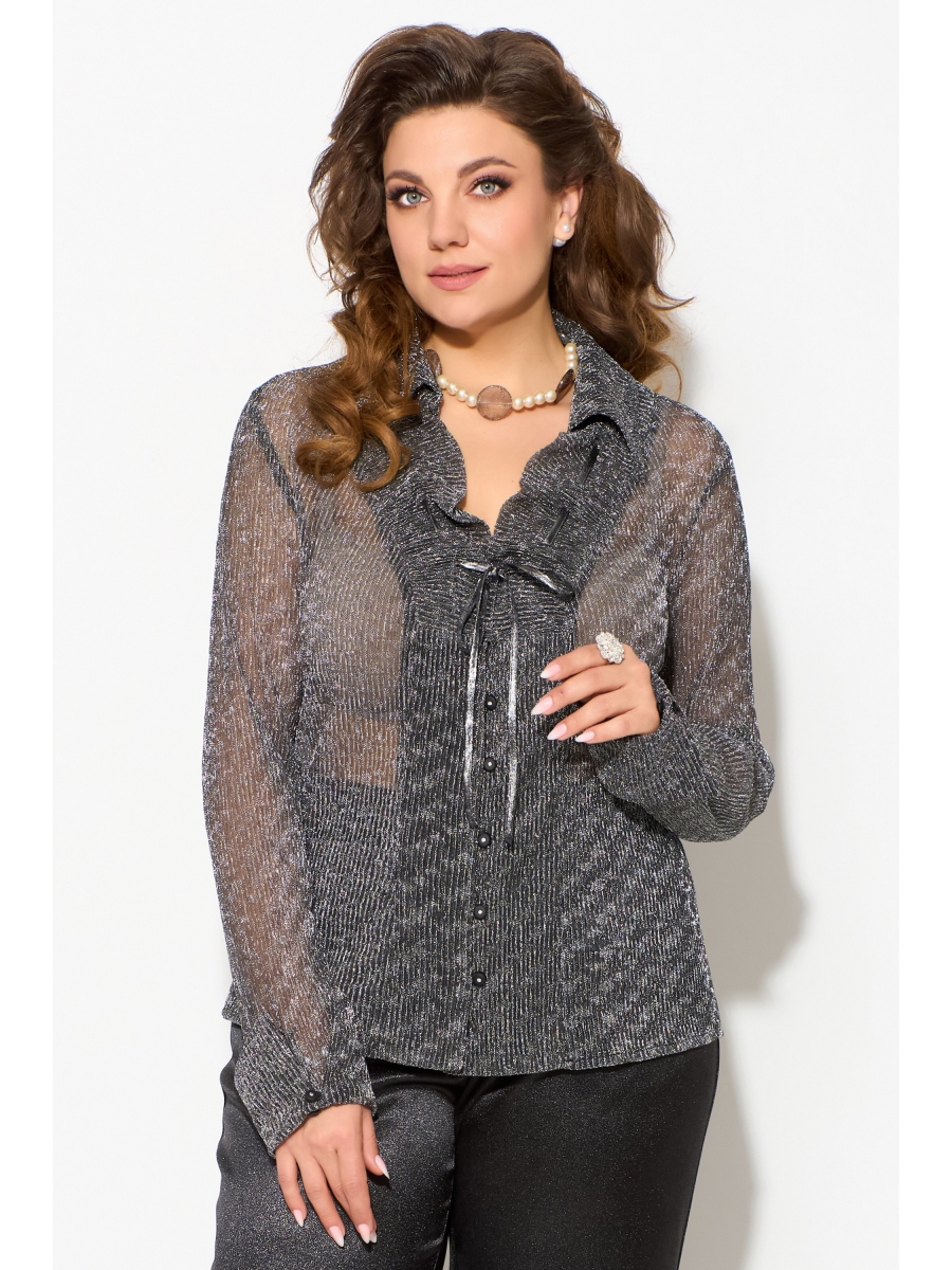 Блузка ""Аста"" нарядная, прилегающего силуэта, выполнена из жатой сетки. По горловине полочки рюша. В рюшу вставлен шнур. Застежка однобортная на навесные петли и пуговицы. Воротник отложной, на стойке, рубашечного типа. Рукав втачной, по низу рукава отложной манжет с застежкой на навесные петли и пуговицы.