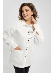 Блузка прямого силуэта, длиной по переду ниже бедер, с неровной линией низа (по спинке блузка удлинена). По боковым обработаны разрезы. По переду, с правой стороны настрочен накладной карман. Застежка на петли и пуговицы по цельнокроеной планке по переду. Воротник рубашечного типа на отрезной стойке. Линия плеча спущена, рукава одношовные, втачные, длинные. По низу рукава обработана сборка, притачана манжета с завязывающимися концами и волан.