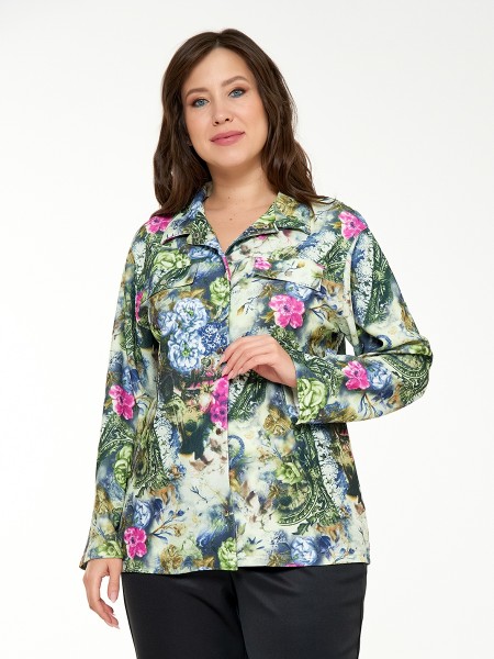 Повседневная блузка-рубашка больших размеров выполнена из трикотажного полотна со стрейчем, застёгивается на кнопки. Отложной воротник, длинный рукав, имитация карманов.