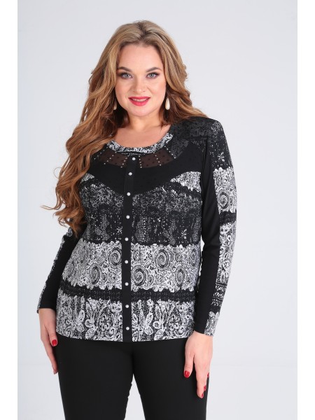 Блузка женская полуприлегающего силуэта, с длинными втачнымидвухшовными рукавами. Изделие выполнено из тканей двух видов - сетка в горошек и блузочного трикотажного полотна двух цветов. Ткань с принтом частично украшена пайетками, что придает блузе чуть заметное сверкание. Вырез горловины округлой формы, с притачной обтачкой по передей части. По переду блузки настрочная планка, украшенная бусинами.