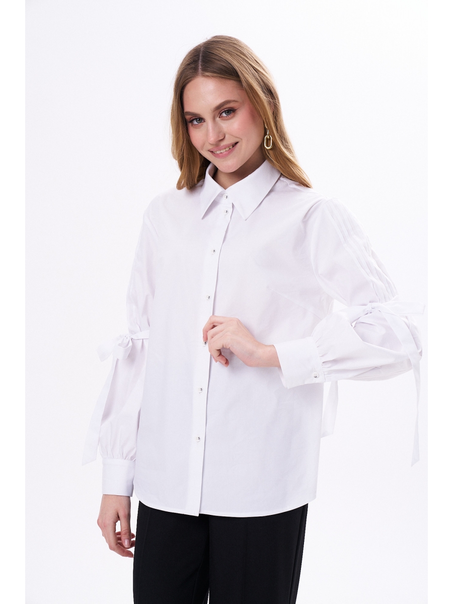 Хлопковая рубашка с акцентом на рукава. Верхняя часть рукава с защипами плавно переходит в объёмный низ со сборкой на манжете. Слегка выше локтя декоративная завязка на бант. Воротник классической формы. По переду нагрудные вытачки. Застёжка на пуговицы.