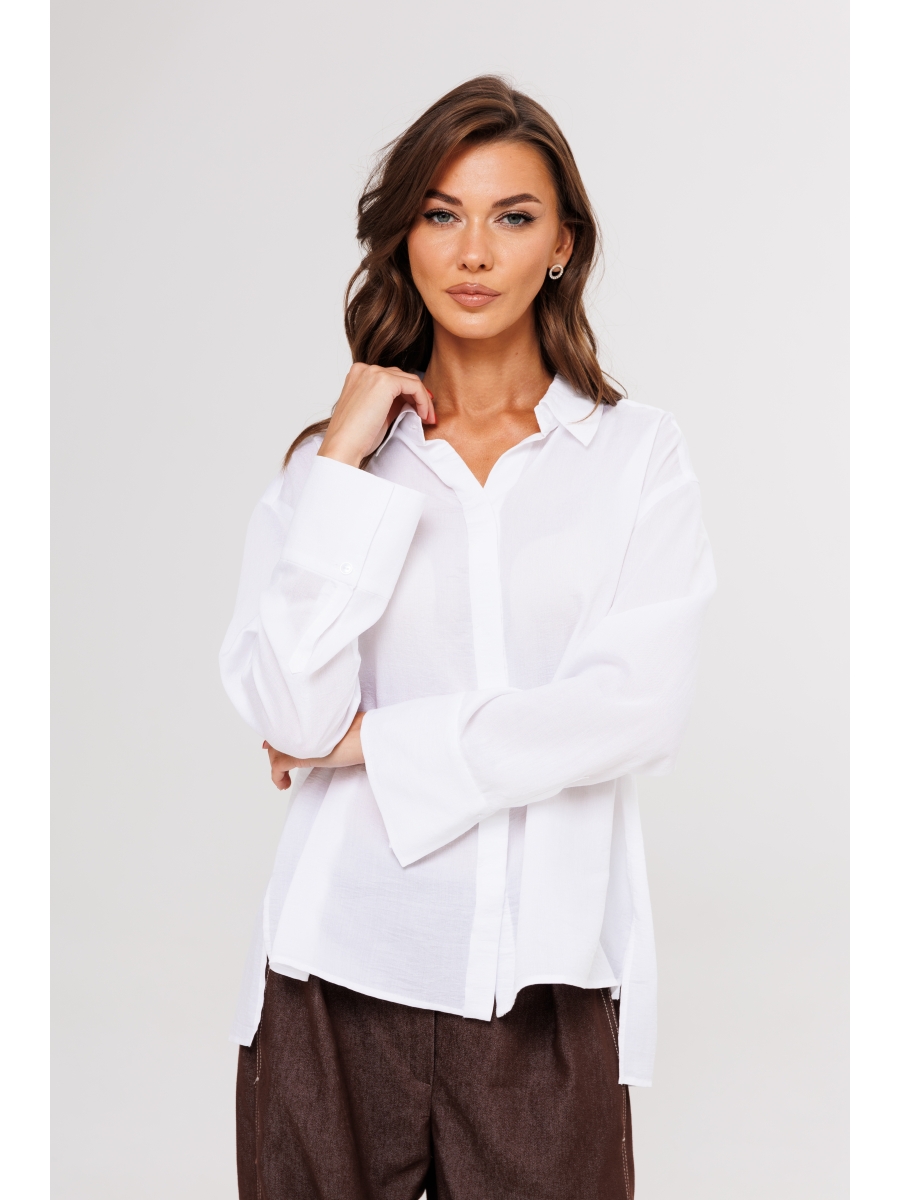 Свободный силуэт, рубашечный покрой, центральная потайная застежка на петли и пуговицы, воротник рубашечный с отрезной стойкой, рукав рубашечный с отрезной манжетой и разрезом в области локтевого шва. Спинка с отрезной кокеткой и двумя мягкими складками.