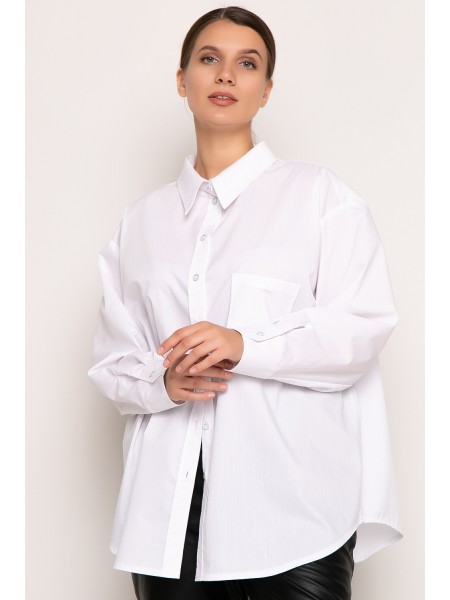 Блуза женская прямого силуэта. Перед по центру с планкой, застегивающейся на петли и пуговицы, с накладным карманом . Плечо спущенное, рукав длинный, втачной, по низу на притачной манжете, застегивающейся на петлю и пуговицу. Спинка с кокеткой. Воротник с острыми концами на стойке, застегивающейся на петлю и пуговицу.