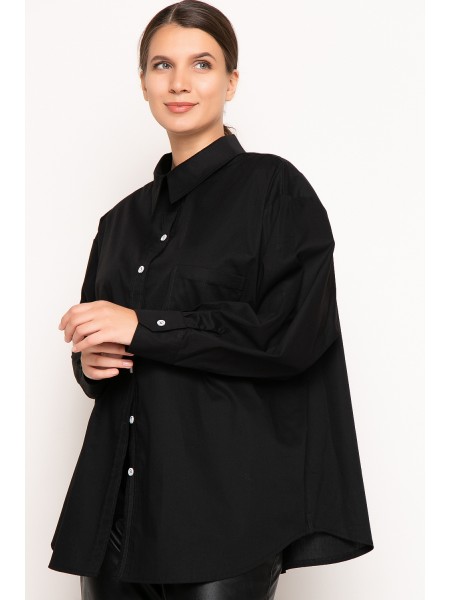 Блуза женская прямого силуэта. Перед по центру с планкой, застегивающейся на петли и пуговицы, с накладным карманом . Плечо спущенное, рукав длинный, втачной, по низу на притачной манжете, застегивающейся на петлю и пуговицу. Спинка с кокеткой. Воротник с острыми концами на стойке, застегивающейся на петлю и пуговицу.