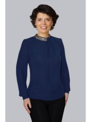 Блуза женская, прямого силуэта с нагрудными вытачками. Воротник втачной, стойка, украшенный стразамипо левой стороне. От линии груди к стойке, по левой стороне, идут складки, закрепленные по горловине. Застежка центральная, по спинке, на «слезку». Рукав втачной, одношовный, с притачным манжетом