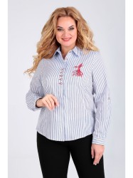 Блуза приталенного силуэта, с центральной бортовой застежкой на потайной планке. С лицевой стороны правой полочки выполнены декоративные петли контрастного цвета. На полочках от продольных рельефов идут нагрудные вытачки. Рукав втачной с притачным манжетом, длину которого можно отрегулировать «патой», разрез выполнен планкой в виде «домика». На спинке имеются талевые вытачки. Воротник на стойке, рубашечный.