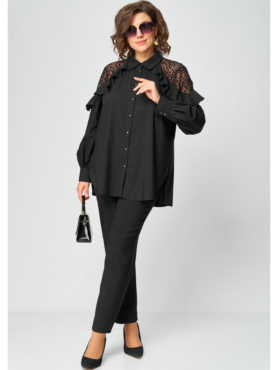 Блузка женская шикарная красивая нарядно-повседневная свободного силуэта выполнена их хлопка в сочетании с элегантным кружевом. Вырез горловины воротник на стойке рубашечного типа, рукав втачной с декоративным подрезом из кружева по низу на притачной манжете. Застежка до верху на обметанные петли и пуговицы. Низ блузы фигурный, в боковых швах обработан разрезы.