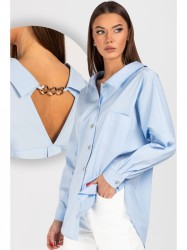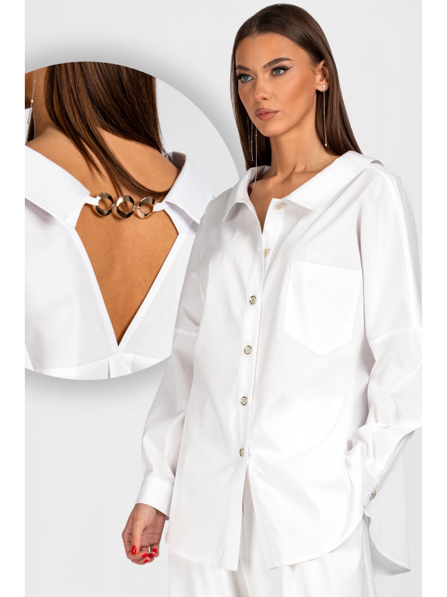 Блузка-рубашка прямого силуэта со спущенным плечом. Перед с центральной бортовой застежкой на 6 петель п пуговиц. На левой части переда настрочен карман. Спинка с кокеткой, бантовой складкой. Кокетка с V-образным вырезом и цепочкой. Рубашка с отложным воротником. Рукав с манжетой на 1 петлю и пуговицу.