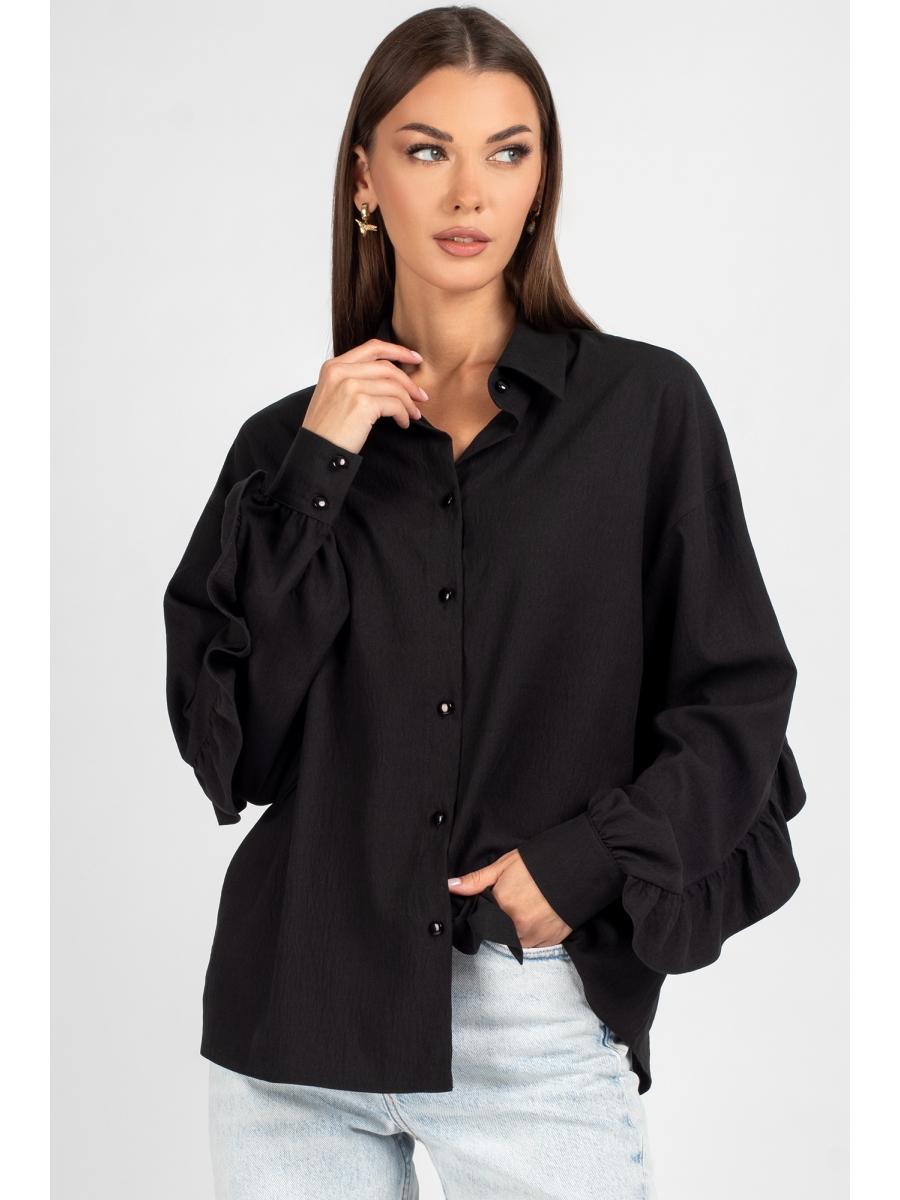 Женская блузка свободного прямого кроя OVERSIZE-силуэта со спущенной линией плеча — идеальный выбор для создания актуального и непринужденного образа. Передняя часть выполнена из двух симметричных деталей и дополнена центральной застёжкой на 7 пуговиц и петель, что обеспечивает удобство и визуальную симметрию. Спинка украшена кокеткой с декоративной рюшей, плавно переходящей на рукава — изысканный акцент, добавляющий женственности. Рукава завершены манжетами на 2 пуговицы, что позволяет регулировать посадку и подчеркивает аккуратность силуэта. Воротник классического рубашечного типа с отрезной стойкой — универсальный элемент, подходящий как для офисного стиля, так и для повседневных образов.