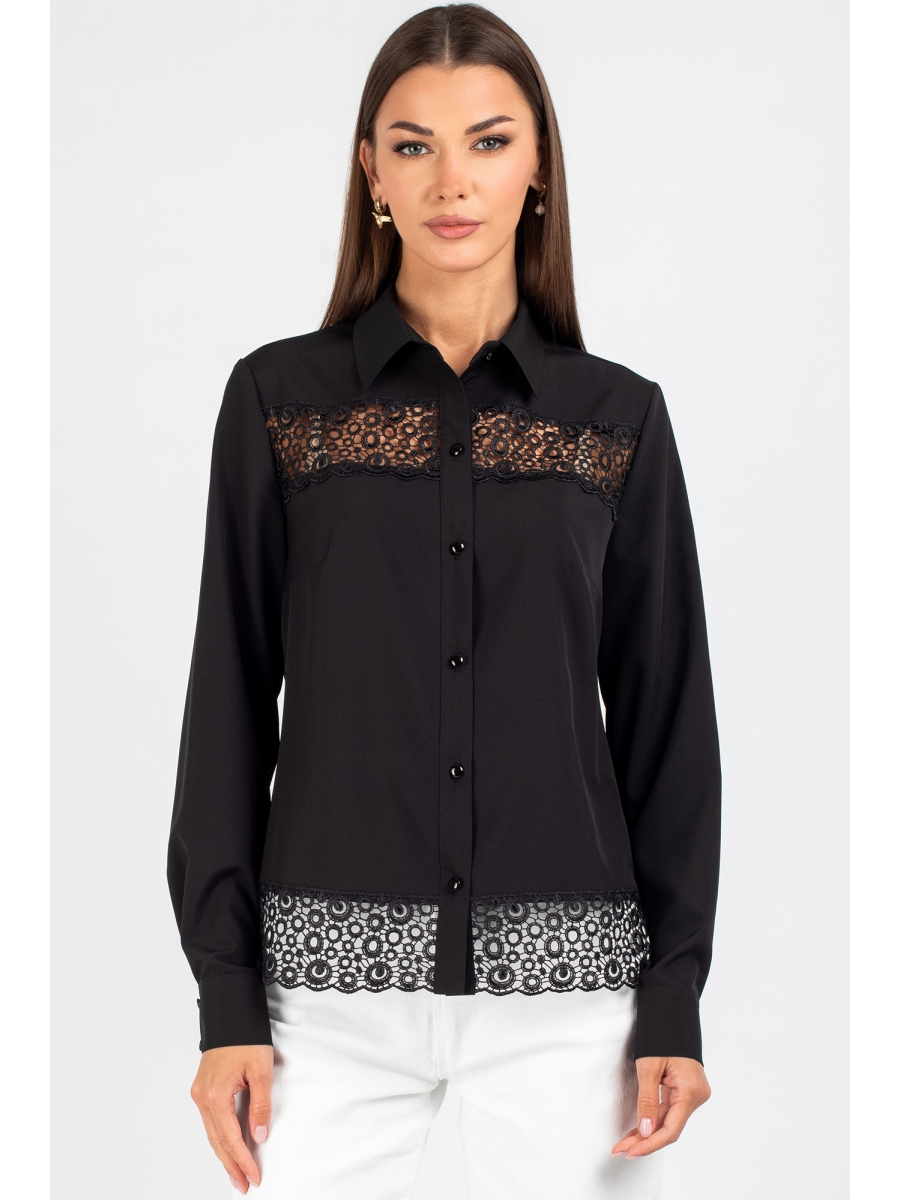 Передняя часть c нагрудными выточками, обеспечивающими комфортную посадку. Центральная бортовая застёжка — на 6 или 7 пуговиц (в зависимости от размера), придаёт образу классическую завершённость. Особое внимание привлекает кружево, изящно нашитое в верхней и нижней части переда — оно добавляет лёгкости и утончённости, делая блузку особенно женственной.