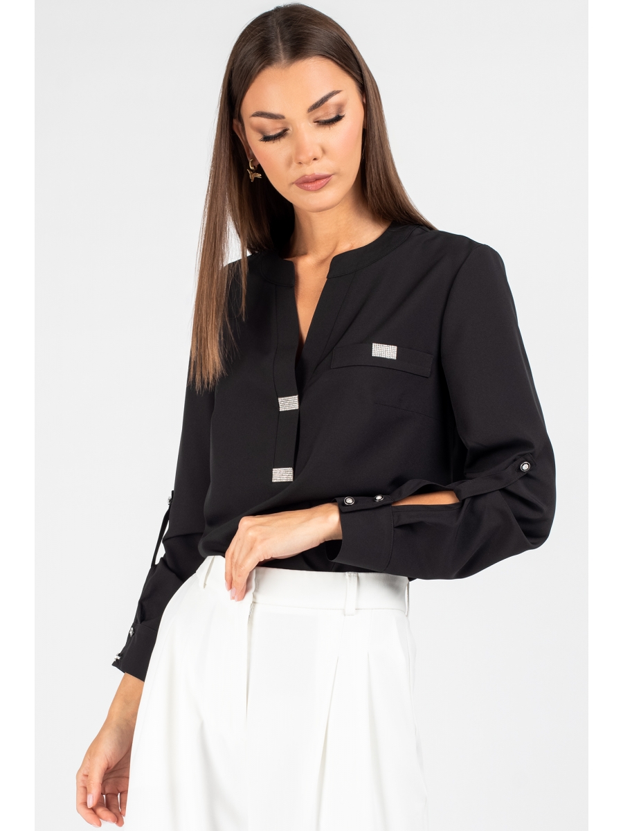 Передняя часть с нагрудными выточками и втачной планкой по левой стороне полочки, где настрочена декоративная листочка, имитирующая карман. Горловина дополнена изящной притачной стойкой, а планка переда и листочка украшены сверкающими серебристыми стразами, добавляющими образу лёгкий блеск. Спинка цельная. Рукав втачной, с настроченной патой и пуговицей для удобства и стильного акцента. Низ рукава с петелькой и притачной манжетой, которая застёгивается на две пуговицы, завершая гармоничный образ блузки.