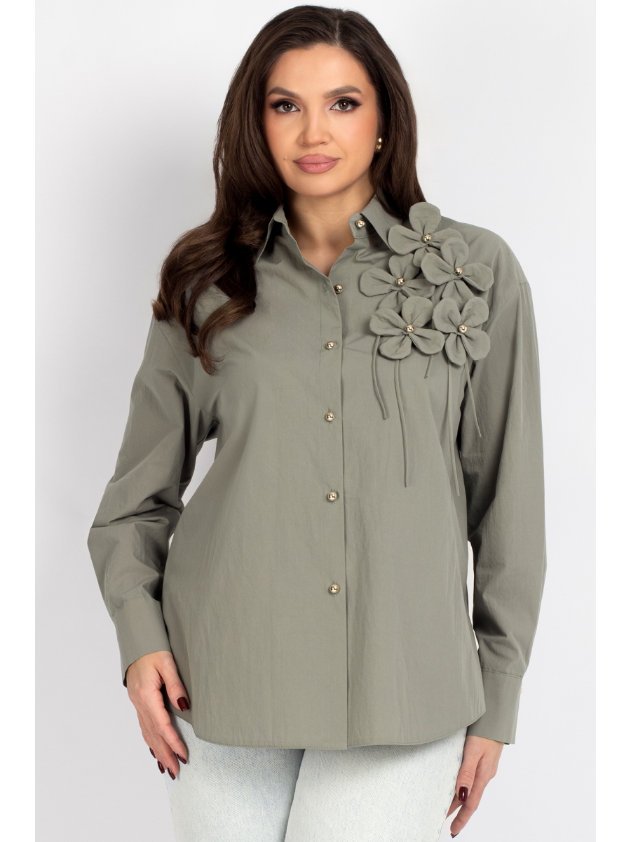 Блузка женская, прямого силуэта со спущенным плечом. Перед из двух частей с центральной бортовой застежкой на 6 петель и пуговицу. Отделочным элементом блузки является 5 цветков, настроченные пуговицами. Спинка цельная. Рукав с притачной манжетой, застегивающейся на 1 петлю и пуговицу.  Воротник рубашечного типа с отложной стойкой.