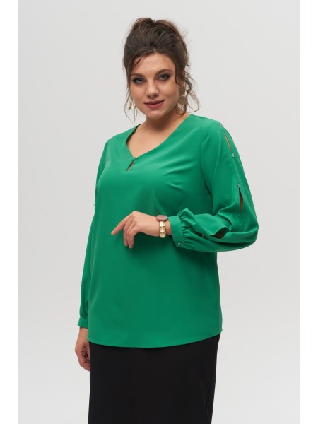 Изготовленная из мягкой на ощупь ткани, она обладает полуприлегающим силуэтом, который выгодно подчеркивает фигуру. Особенно привлекательны втачные рукава с разрезами по всей длине и навесными петельками, украшенными пуговицами на притачной манжете. Эти детали добавляют блузе изысканности и шарма.