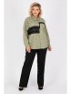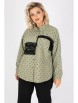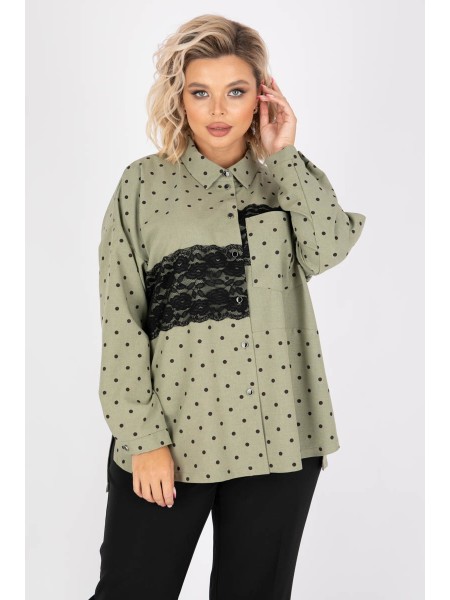 Эффектная рубашка из текстильной ткани цвета хаки. Круглый вырез горловины оформлен отложным воротничком. По переду изделия планка с застежкой на пуговицы. Втачные рукава обработаны манжетами на пуговицах. Перед изделия украшен вставками из кружева и дополнен накладным карманом. Рост модели — 170 см.
