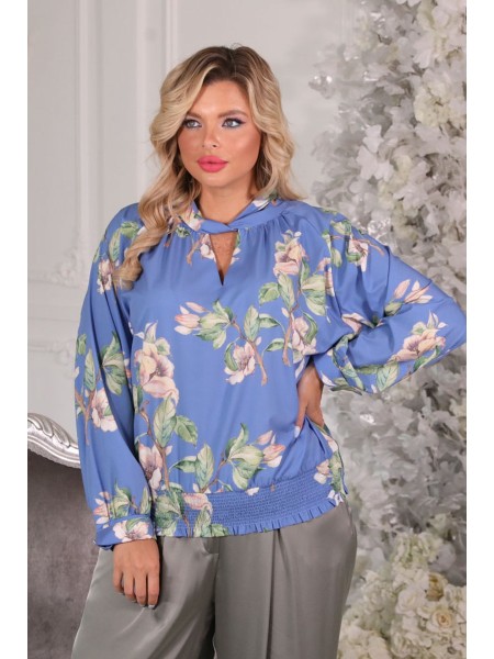Очаровательная блузка свободного силуэта из текстильной ткани голубого цвета. Вырез изделия дополнен оригинальным воротником с перекрутом и дополнен разрезом. Цельнокроеные рукава обработаны манжетами с застежкой на пуговицы. Низ изделия обработан декоративным швом с резинкой. Длина изделия по спинке от плечевого шва до низа изделия — см. Рост фотомодели — 170 см