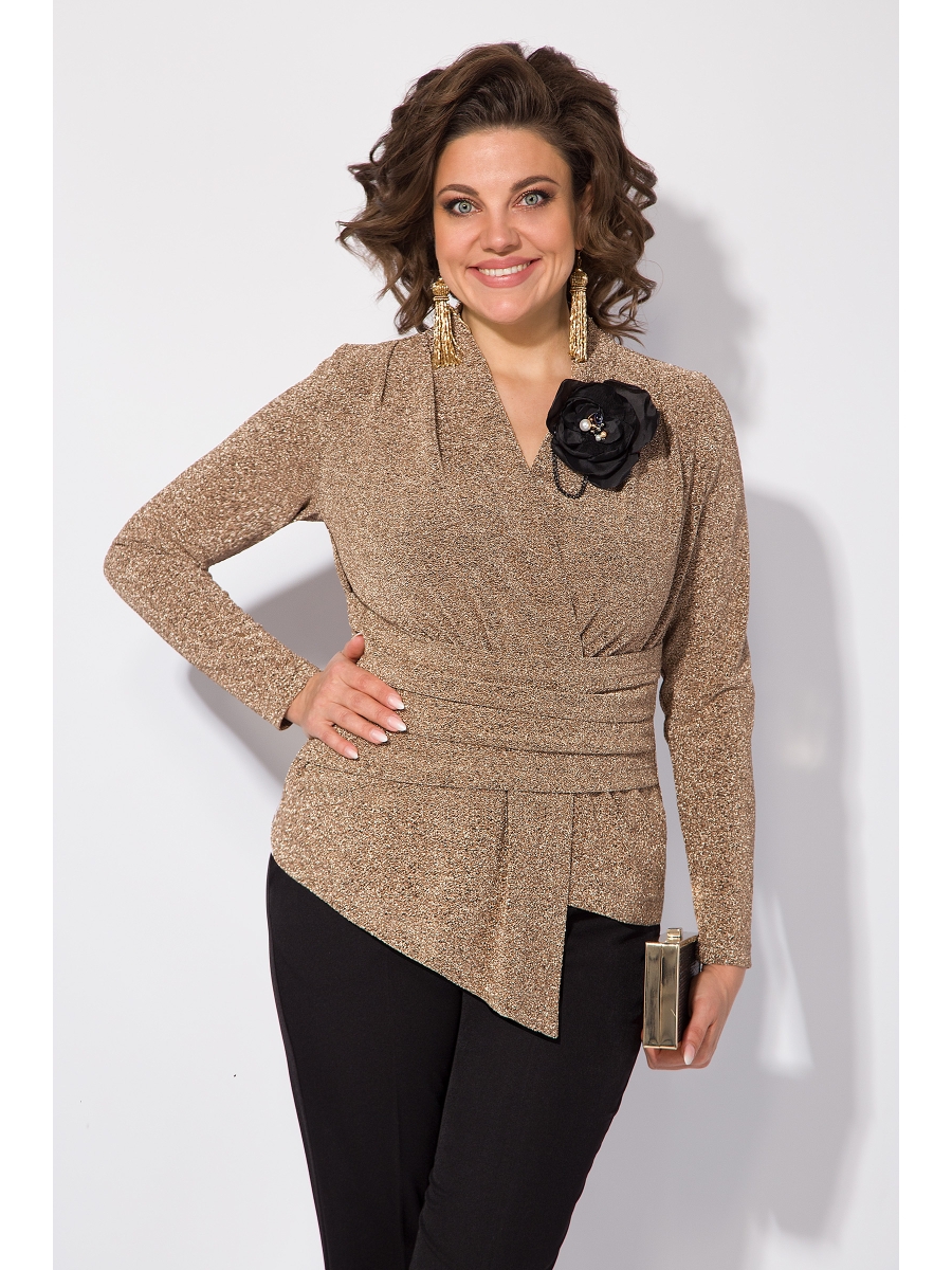 Эффектная нарядная блузка, выполнена из мягкого трикотажа с мерцающим эффектом. Такой дизайн ткани придает необычное переплетение нитей: с изнанки мягкий однотонный трикотаж! Вырез горловины мягкая стойка, переходящая в V-образный вырез с имитацией запаха. По полочке заложены декоративные складки для комфортного прилегания изделия. Низ блузки ассиметричный. Пояс декорирован задрапированным поясом из основной ткани, что зрительно стройнит и скрывает все недостатки фигуры. Рукав в точной, длинный. Спинка приталенная, без особенностей.