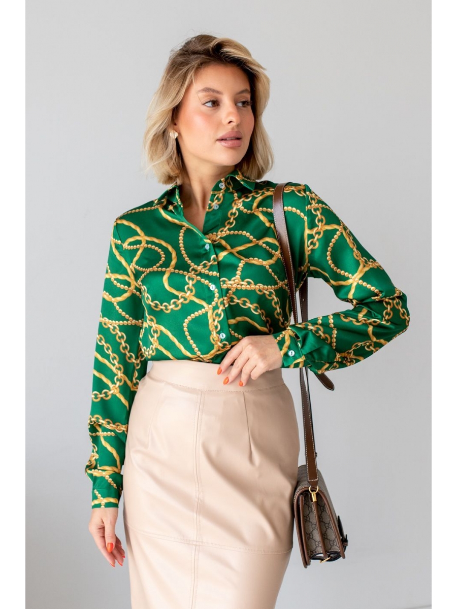 Ткань: блузочная, набивная. Блузка простого, прямого силуэта, воротник на стойке, спереди – потайная застежка на пуговицы. Рукав длинный. Длина ок. 65 см.
