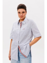 Функциональный накладной карман не только дополняет дизайн, но и делает рубашку практичной в повседневной носке. Асимметричный низ и боковые разрезы придают модели динамику, слегка отступая от классических канонов. Завершающий штрих — декоративная тесьма на планке, которая добавляет деликатный акцент, не перегружая общий вид.