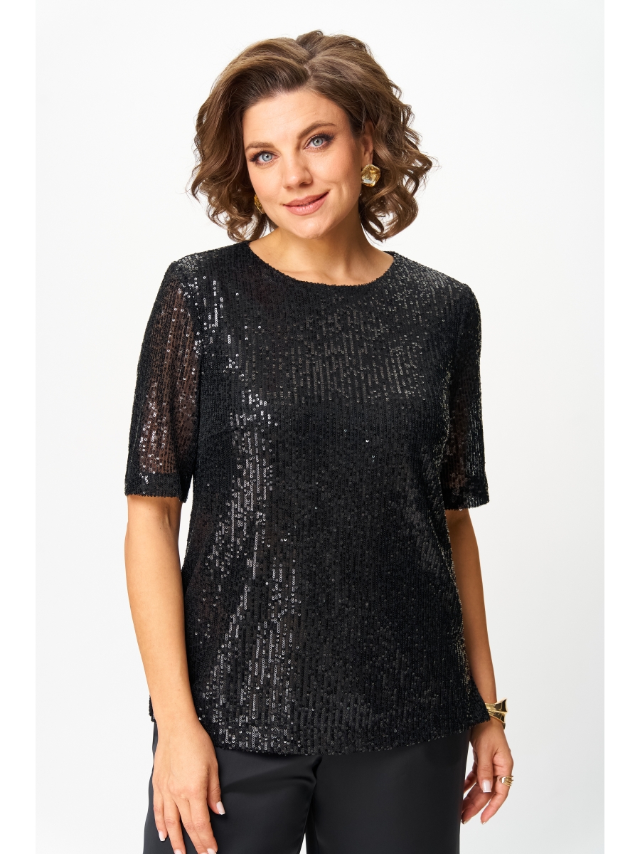 Блузка женская прямого силуэта из ткани пайетка с втачным рукавом. Горловина округлой формы обработана обтачкой. По линии груди вытачки. Рукав длиной до уровня локтя. В боковых шах обработаны разрезы. Перед и спинка блузки на трикотажной подкладке.