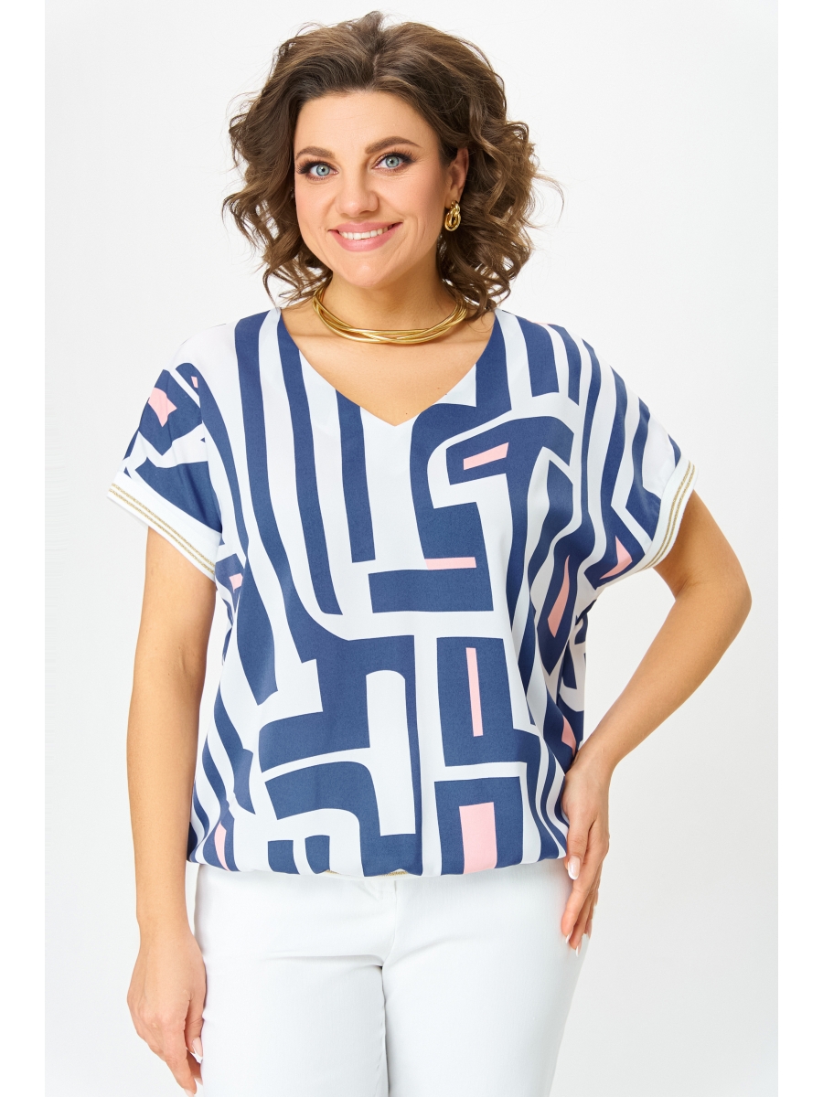 Блузка из мягкой вискозной ткани свободного силуэта со спущенной линией плеча. Полочка цельная, спинка с центральным швом. Горловина V-образной формы. Низ блузки и низ цельнокроеного рукава обработаны декоративным трикотажным довязом.