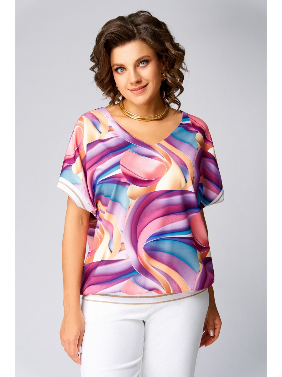 Блузка из мягкой вискозной ткани свободного силуэта со спущенной линией плеча. Полочка цельная, спинка с центральным швом. Горловина V-образной формы. Низ блузки и низ цельнокроеного рукава обработаны декоративным трикотажным довязом.