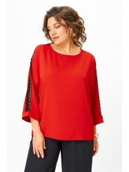 Блузка женская из текстильной ткани с цельнокроеным рукавом. Прямого силуэта. По спинке расположен подрез. В шов вставлено кружево. Рукав 3/4, низ рукава с манжетой. По плечевому шву вставлено кружево. Вырез лодочка. Обработан притачной бейкой.