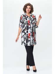 Блуза удлиненная из льняной ткани, свободного силуэта. Застежка центральная на петли-пуговицы. Воротник отложной на стойке. По переду обработаны кокетки и вертикальные рельефы от нее. По левой полочке в области груди небольшой настрочной карман. Спинка с кокеткой. Рукава укороченные, втачные, с патой.