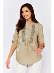 Оформить заказ →Блуза прямого силуэта. По спинке плечевые вытачки. По переду нагрудные вытачки, по центру планка с застёжкой на петли и пуговицы. Вдоль планки одноцветная вышивка. Низ фигурный с разрезами в боковых швах. Воротник-стойка. Плечо слегка спущено. Рукав рубашечного покроя, 3/4 с застёжкой на пату и пуговицу.